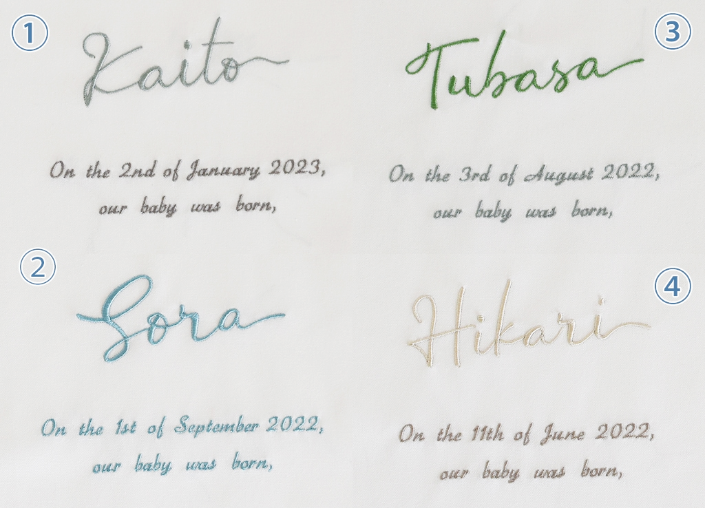 刺繍内容のご紹介です。お子様のお名前、そして誕生日、名づけ、英文1文メッセージが入ります。締めくくりはパパママのお名前で 最後がパパママからのサインみたいでカッコいいですね。