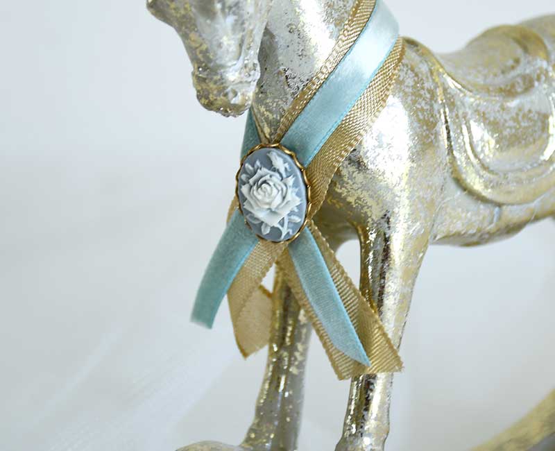 馬具装飾として首にはリボンを☆リボンは素材が違うゴールド、クラシックブルーをクロス。中央には小さなカメオを付けました