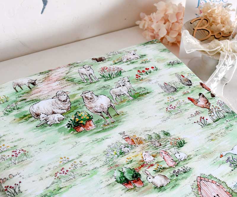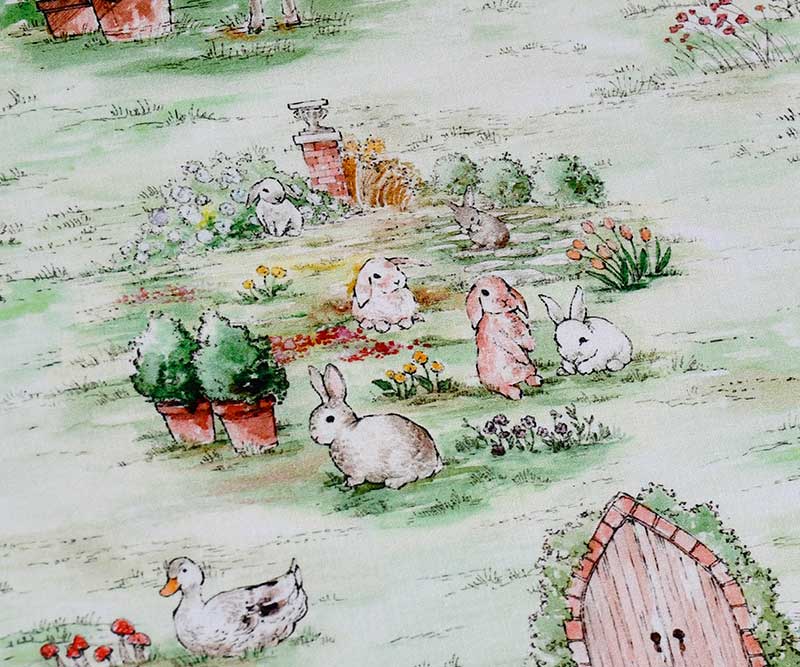 中央にはウサギさん親子。キャラクターにはしらず落ち着いた自然なプリントデザインは海外プリント物ならでは