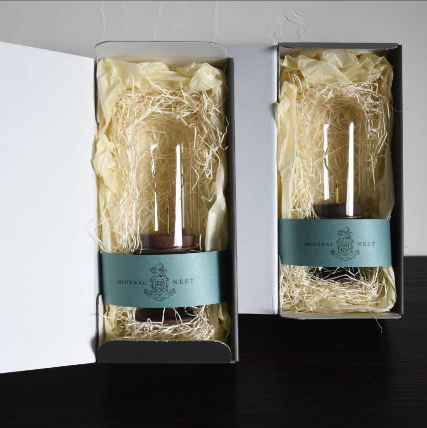 このガラスドームに移してあげると、石たちもなんだか誇らしげな表情に見えます。鉱石のかたちに合わせることができる真鍮の支柱が実現した、美しい空間です。