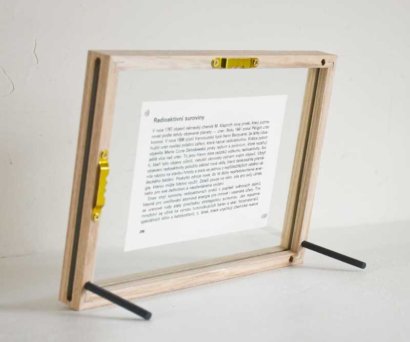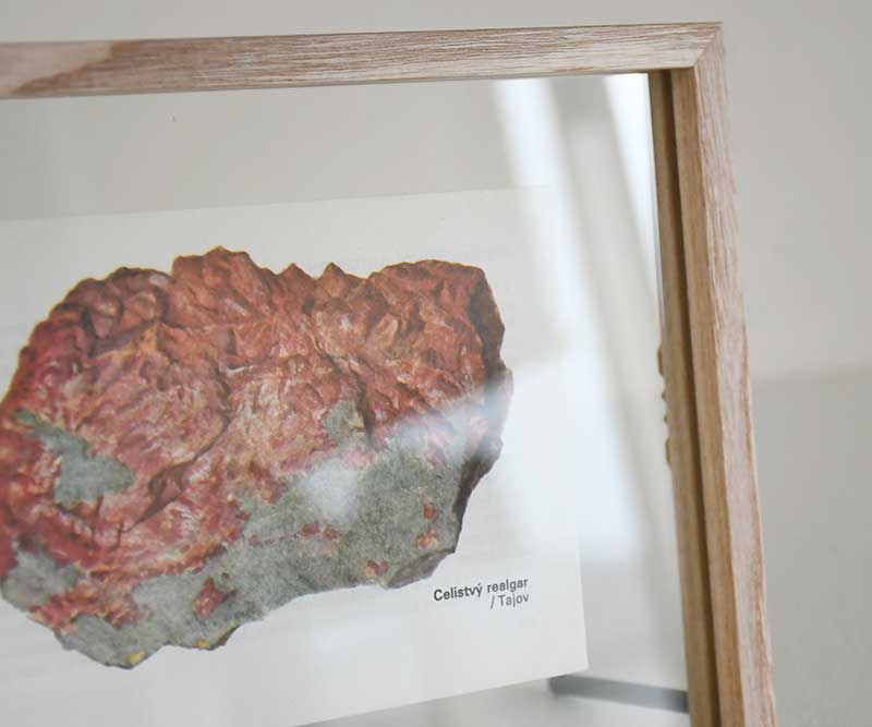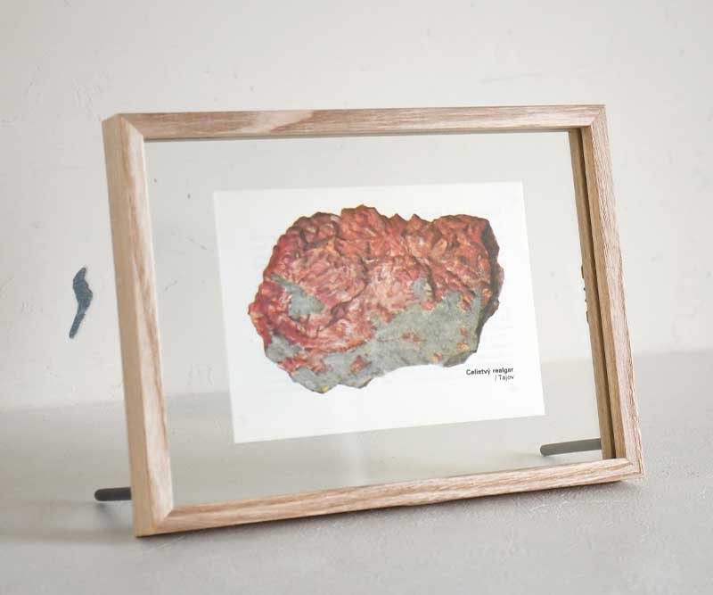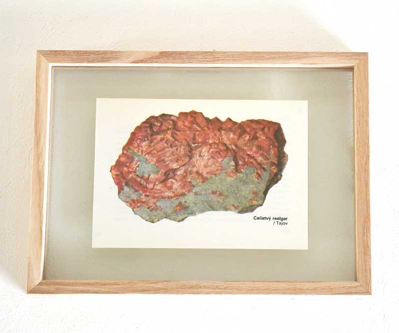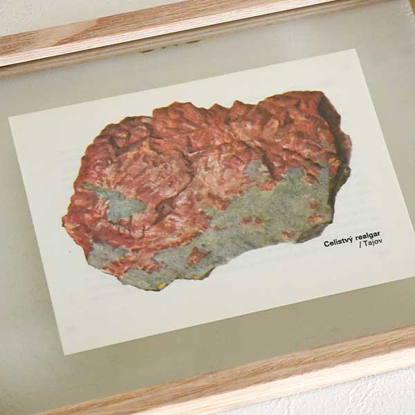 チェコの古い鉱物図鑑をそのままおさめたフレーム。余白部分が美しい、天然木とガラスの額縁です