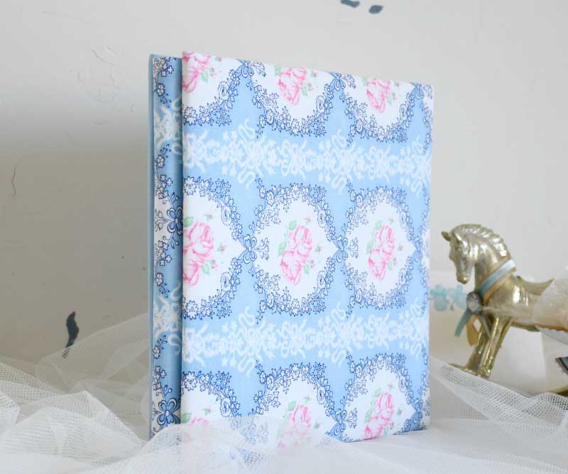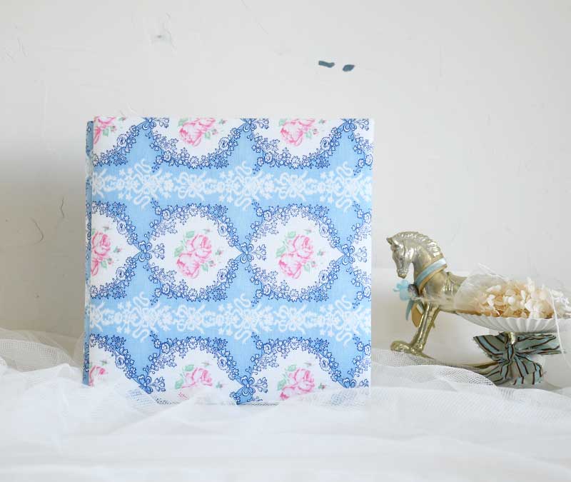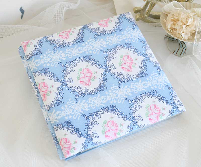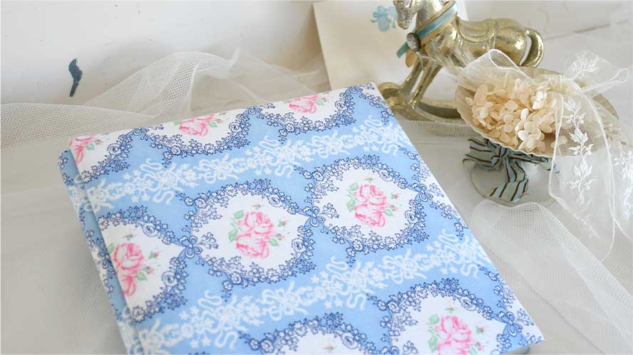貴重なビンテージコットン。白抜きのリボン、丸い縁どりの中に優しい2輪の薔薇が美しい。背表紙は共布です。