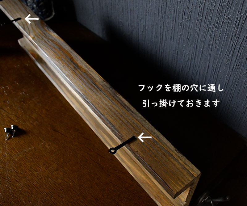 ブロガーさんが書いていた記事で偶然みつけたこちらのピンタイプのフック。フック部分が長くて、合わせてみたら当店のウォールシェルフにピッタリサイズでした