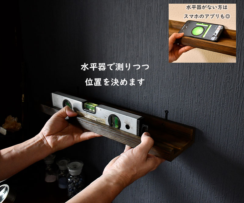 水平器をシェルフにのせて、場所を決めます。私は目打ちで印をつけましたよ