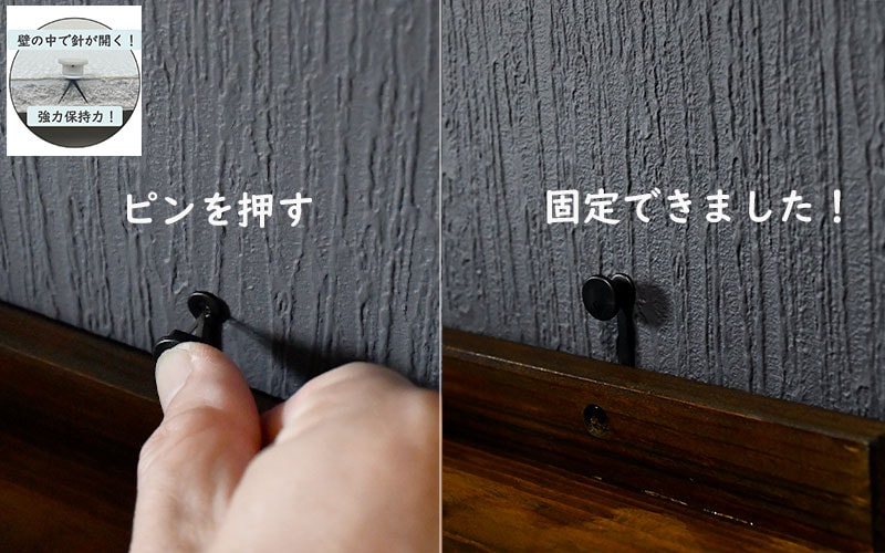 ピンを押すと壁の中で針が開く仕組みに。一般的なフックピンはピン2本をそれぞれ金槌で叩くのですが、片手で棚板を押えながらの金槌は女性にはツライ。。このピンは簡単すぎて驚き!