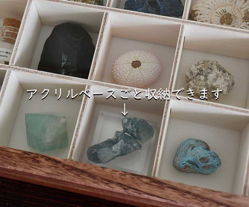 実際に入れてみるとあれもこれも、大体のサイズの物が入りました。そして!ポイント!購入したときに付いているアクリルベースごと収納できます!アクリルが外せない石もありますので、ココは嬉しいですよね