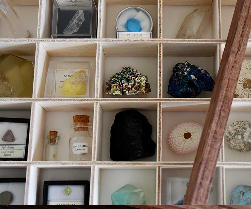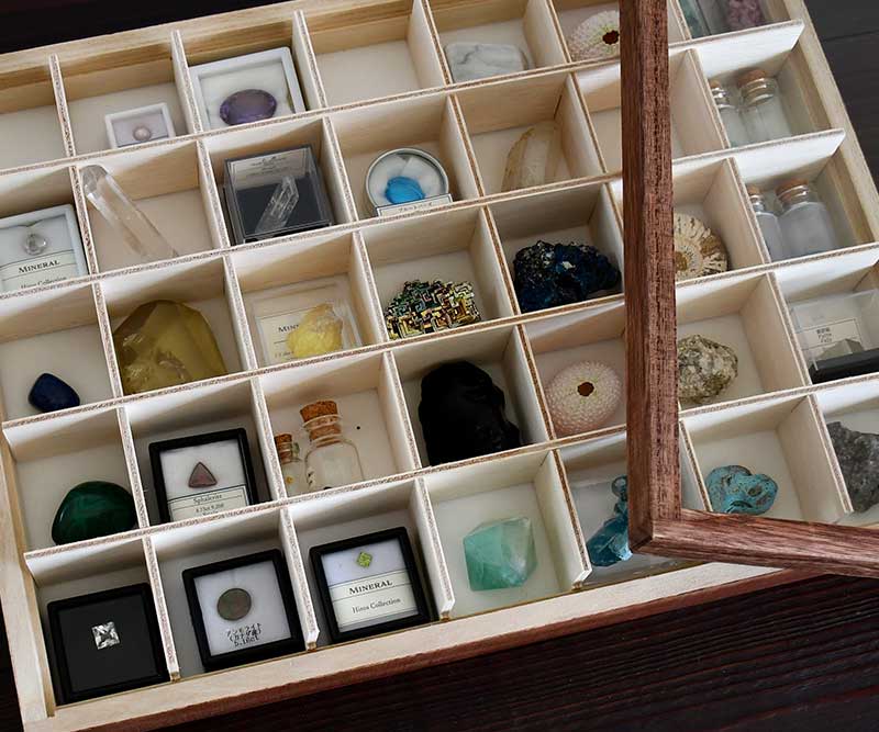 一期一会で出会った愛着のある石たちだからこそ、いつでも見える美しい収納に。自分だけの鉱物標本の完成です