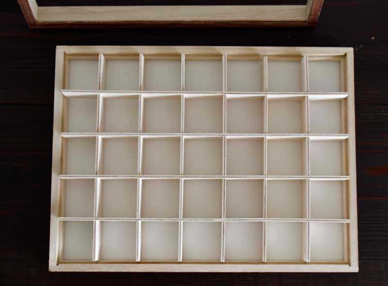 鉱物NEST・オリジナルで標本箱を製作しました。こちらは仕切り板タイプで、全部で35マスと収納たっぷりです