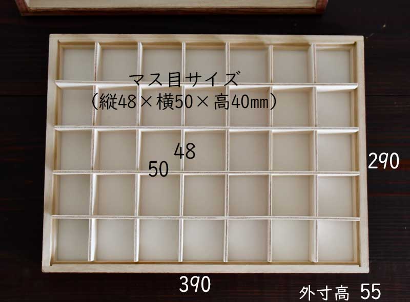 標本箱は外寸390mm×29mm。特大サイズなので引き出しにいれていたコレクションもきれいに収納。マス目の内寸は縦48×50mmなので定番の4㎝ルースケース、4㎝アクリルブロックごと入れることができます