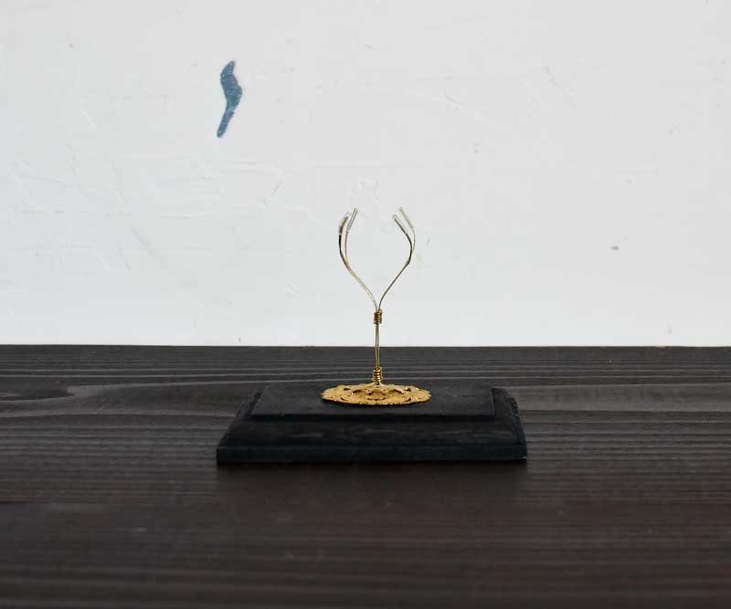 繊細な真鍮の透かし模様が美しいスタンド。艶消しの木の黒と相性が良いです
