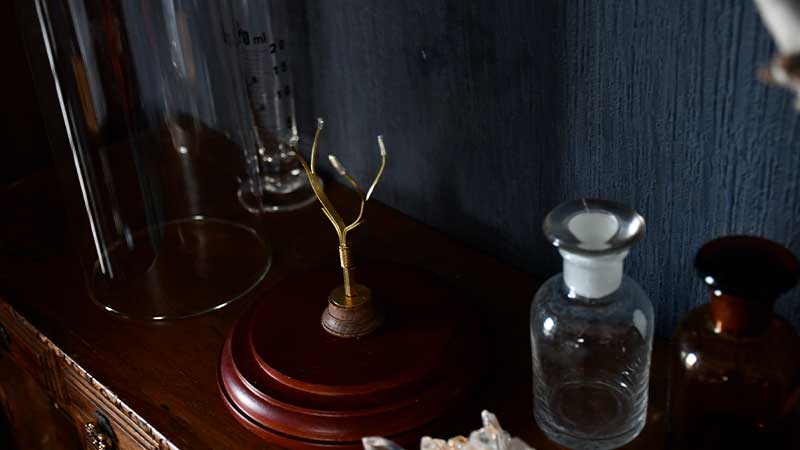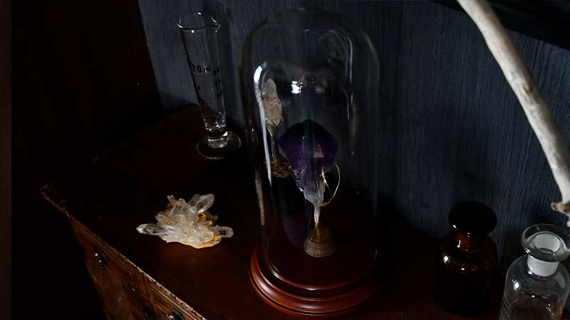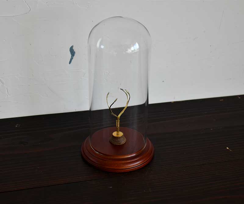 アンティーク感たっぷりのガラスドームに『鉱物スタンド』をプラスしました。10㎝ほどの大ぶりの石でも真鍮の爪がしっかり支えます