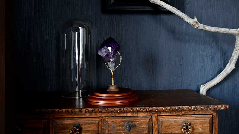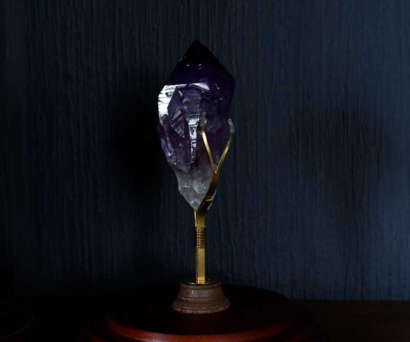 アメジストの色の濃淡が美しく映え、光があたるとより綺麗です。切り出されたままの自然美を感じることができる鉱物スタンドです